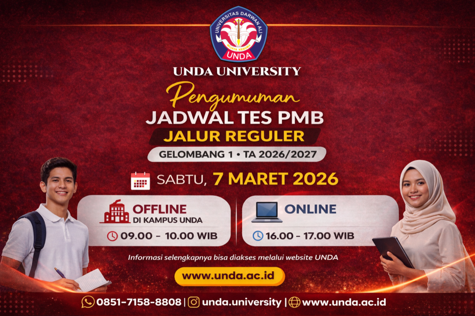 UNDA University akan melaksanakan Tes Penerimaan Mahasiswa Baru (PMB) Jalur Reguler Gelombang 1 Tahun Akademik 2026/2027 pada Sabtu, 7 Maret 2026. Pelaksanaan tes ini merupakan salah satu tahapan seleksi bagi calon mahasiswa baru yang telah melakukan pendaftaran pada periode Gelombang 1.
