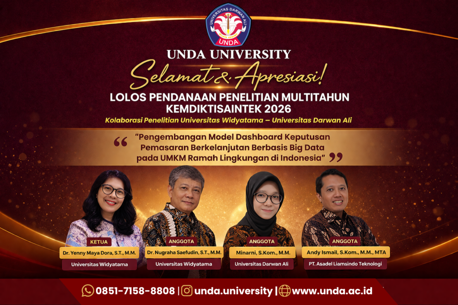 Sampit, UNDA University – Universitas Darwan Ali (UNDA) kembali menorehkan prestasi membanggakan di tingkat nasional. Melalui kolaborasi strategis bersama Universitas Widyatama, tim peneliti berhasil lolos pendanaan Penelitian Multitahun Kemendiktisaintek Tahun 2026.
